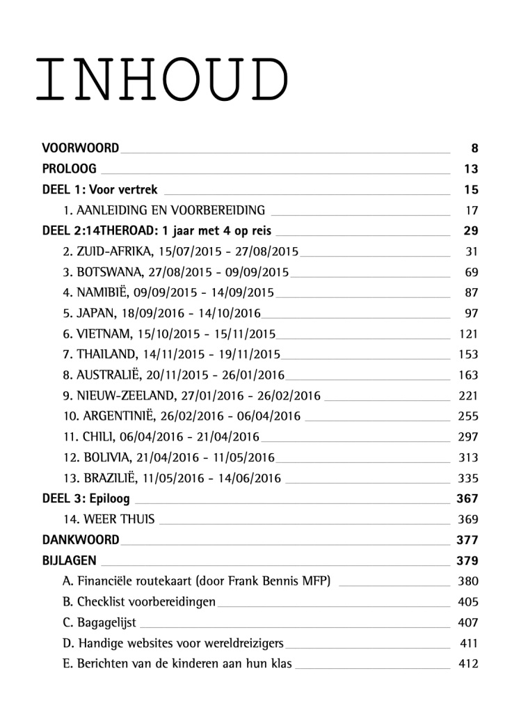 Na het zien van een aflevering van ‘Floortje naar het einde van de wereld’ waren Frank en Joyce bijna niet meer te houden. Op 14 juli 2015 gingen zij een jaar op wereldreis met hun kinderen Julie (toen 11 jaar) en Simon (9 jaar). Dit is Joyce’s persoonlijke verslag van hun belevenissen in Zuid-Afrika, Botswana, Namibië, Japan, Vietnam, Bangkok, Australië, Nieuw-Zeeland, Argentinië, Chili, Bolivia en Brazilië. Het verhaal begint met wat er vooraf geregeld moest worden. Dan volgt het fantastische leven op reis met de overweldigend mooie natuur, interessante en hartverwarmende ontmoetingen, zelf de kinderen lesgeven op de prachtigste locaties, reizen met allerlei soorten vervoermiddelen en overnachten in backpackershuizen, hostels, (dak-)tenten, een luxe lodge of een camper. Enkele voorbeelden van onvergetelijke ervaringen: walvissen en de ‘Big Five’ spotten in Zuid-Afrika, kamperen tussen wilde dieren in Botswana, quadrijden in de Namibwoestijn, judoles in Tokio, helpen op een paardenboerderij in Australië, schapen drijven in Nieuw-Zeeland, orka’s spotten en paardrijden in Patagonië, vicuña’s door een meer zien plonsen in een adembenemend Andes-landschap, slapen in een hangmat in de Pantanal en snorkelen in de helderste jungle-rivier van Brazilië… Tot slot is te lezen hoe het voor ieder was om na terugkomst in Nederland het gewone leven weer op te pakken. Voor wie ook (met kinderen) op wereldreis wil, bevat dit boek praktische tips en lijsten voor de voorbereidingen, bagage, wat handige websites en een uitgebreide financiële routekaart, geschreven door Frank (Financieel Planner).