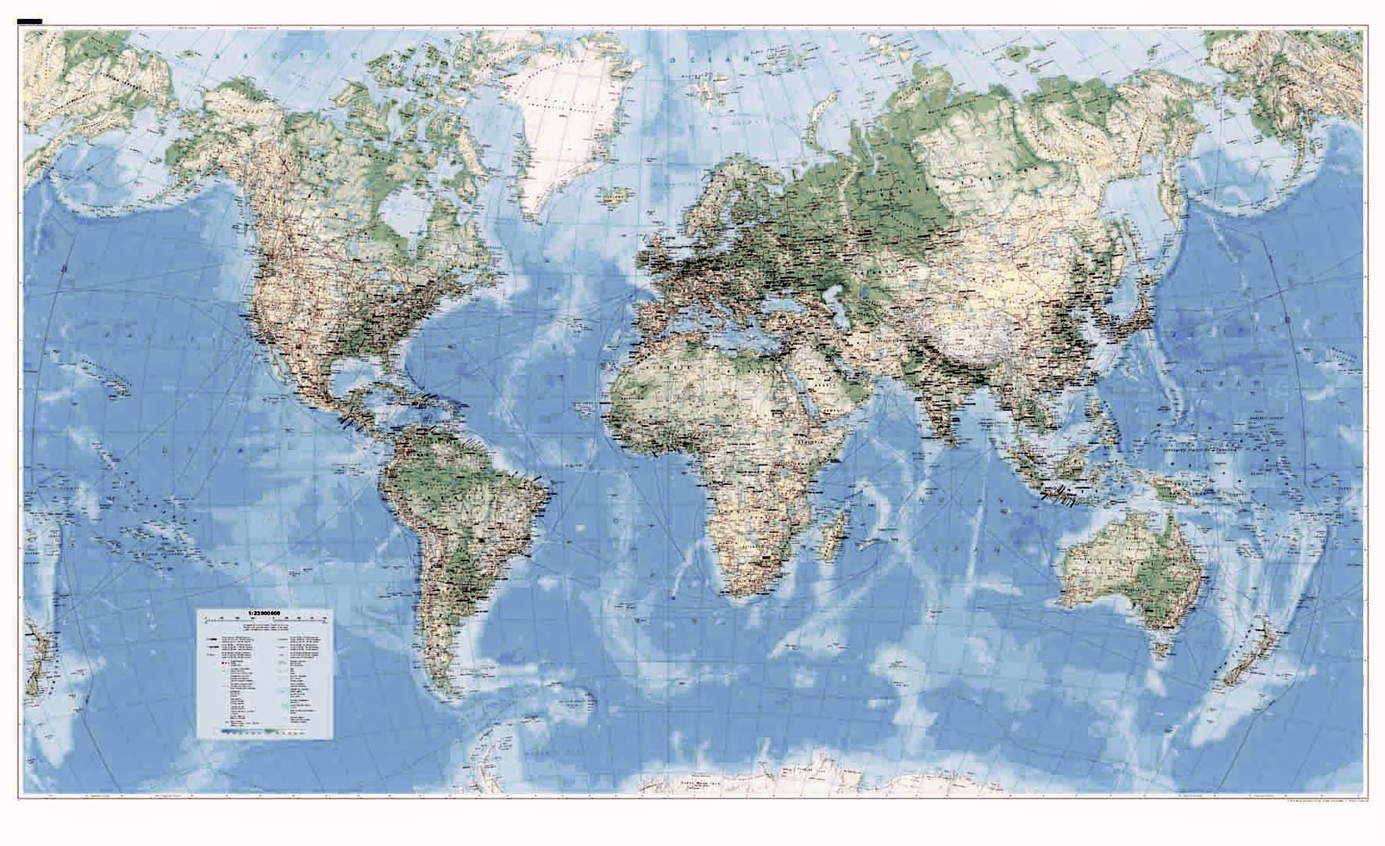 Kaarten en gidsen > Reizen vanuit je luie stoel > Wandkaarten > Wereld als geheel > [16] Wereld Natuurkundig 1:23.000.000 PAPIER