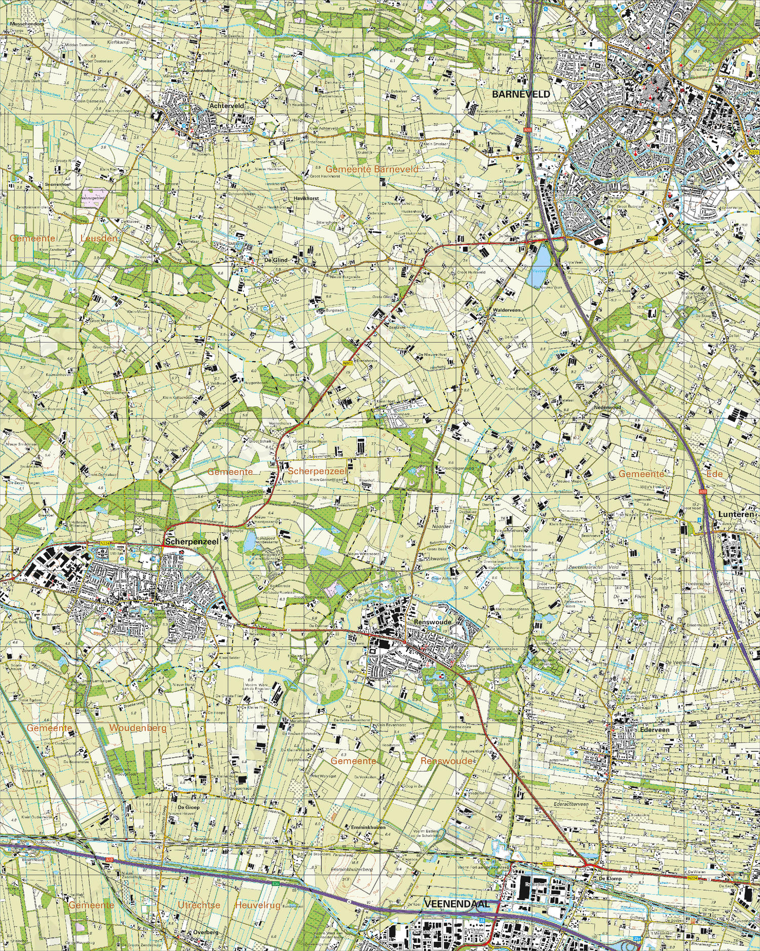 De topografische kaart op de schaal 1:25.000 geeft een zeer gedetailleerd beeld van het terrein. Prima kaart om mee te wandelen, er zijn geen Nederlands kaartenseries met meer detail! Ze zijn niet in eerste instantie bedoeld als toeristische kaarten, hetgeen betekent dat er bijvoorbeeld geen wandelknooppunten of gemarkeerde routes op staan ingetekend. Maar wel alle voetpaden, en wel héél precies. Daarnaast bieden ze veel inzicht in landgebruik, reliëf (hoogtelijnen), bebouwing, wegenpatroon, water, natuur, etc. Daarmee zijn ze de beste kaarten om van tevoren een gebied te verkennen en/of je route mee te plannen.