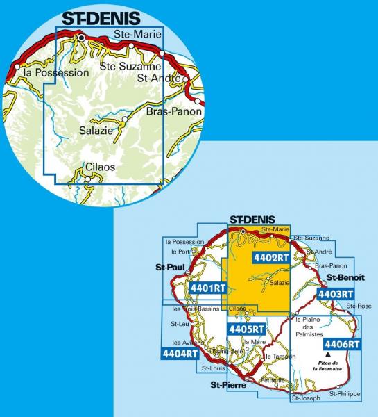 Kaarten en gidsen > Wandelen > Wandelkaarten > Afrika > Eilanden voor de Afrikaanse Oostkust > de kleine eilanden > Réunion > 4402RT St-Denis / Cirques de Mafate & Salazie, Reunion | wandelkaart 1:25.000