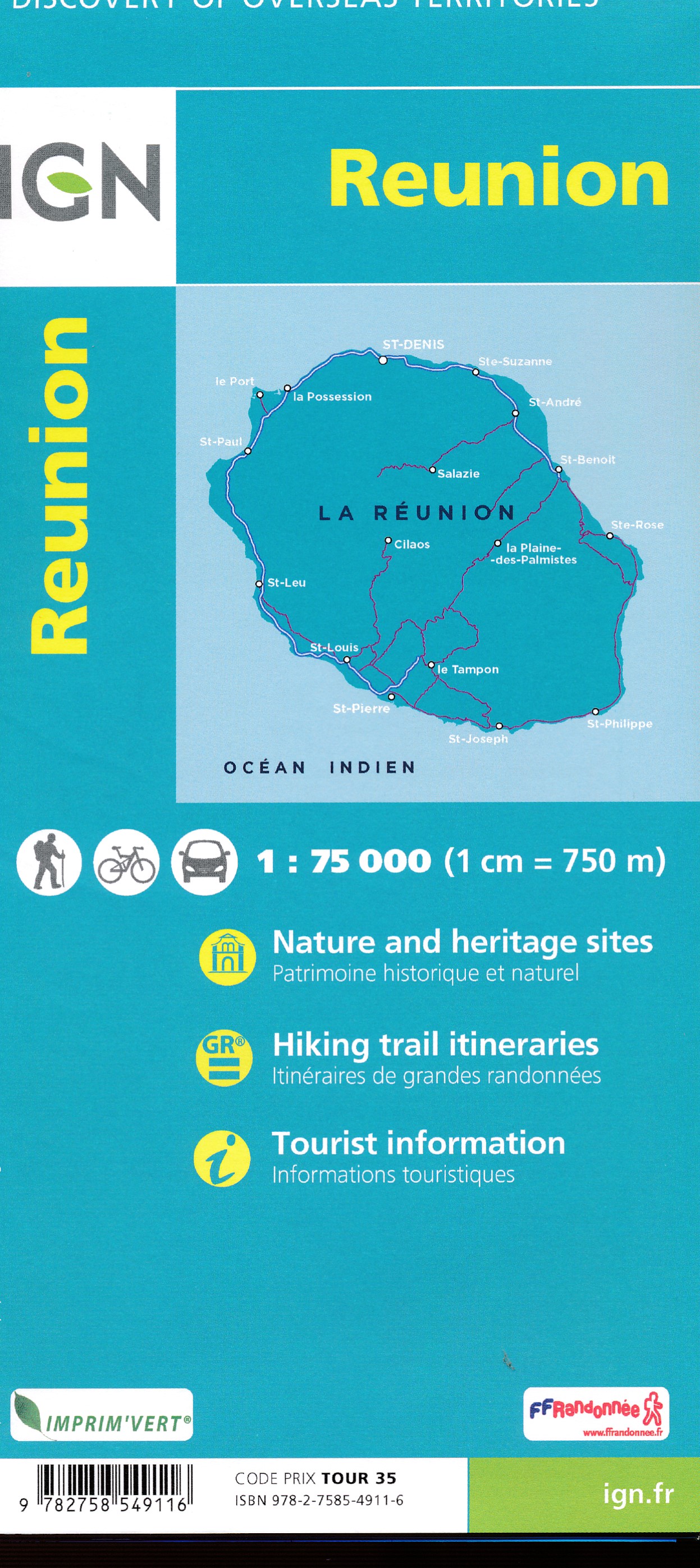 Réunion op een gedetailleerde, GPS-compatibele kaart op 1:75.000, voorzien van hoogtelijnen, met een heldere presentatie van de topografie van het eiland. De kaart toont wandelroutes, bezienswaardigheden en toeristische faciliteiten, plus een stratenplan van Saint-Denis.