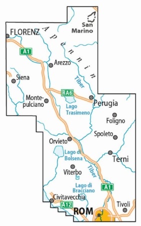 Mooie gedetailleerde fietskaart, gedrukt op scheur- en watervast materiaal. Ingetekende route van Florence naar Rome. Symbolen voor praktische toeristische informatie.