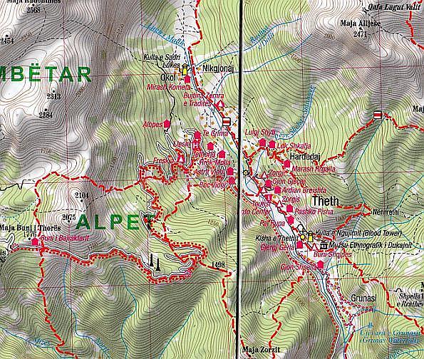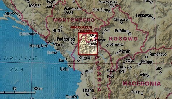 Prima wandelkaart van het gebied Prokletije. Op de achterkant een kaart van het natuurgebied Durmitor. Hoewel qua schaal niet bijzonder gedetailleerd, toch prima bruikbaar wegens de heldere en fijne cartografie. Stevig en geplastificeerd. Met ingetekende routes, hoogtelijnen, symbolen voor accommodatie.