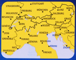 Handige overzichtskaart van de Alpen. Dus Zwitserland, Oostenrijk en (delen van) de aangrenzende landen. Met plaatsnamenregister, afstandentabel. De tekst in de legenda is in het Duits, Frans, Engels en Italiaans.