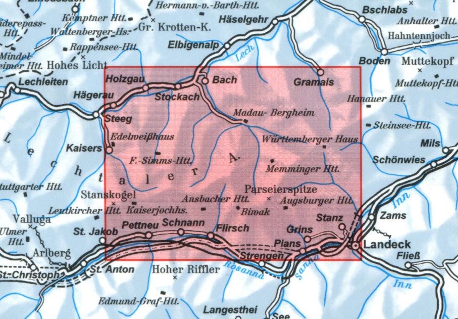 Gedetailleerde wandelkaart / bergsportkaart van de omgeving van de Lechtaler Alpen / Parseier Spitze.