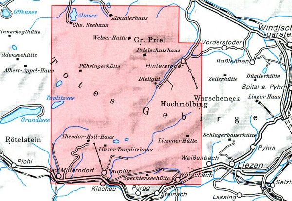 Gedetailleerde wandelkaart / bergsportkaart van de omgeving van het centrale gedeelte van het Totes Gebirge.