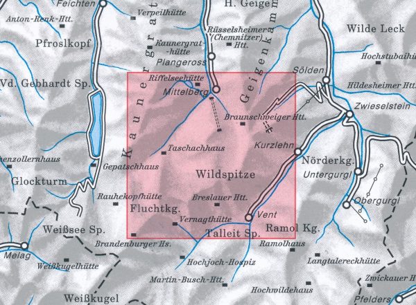 Gedetailleerde wandelkaart / bergsportkaart van de omgeving van de Ötztaler Alpen / Wildspitze.