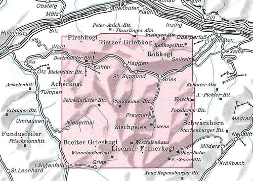 Gedetailleerde wandelkaart / bergsportkaart van de omgeving van de Stubaier Alpen / Sellrain.
