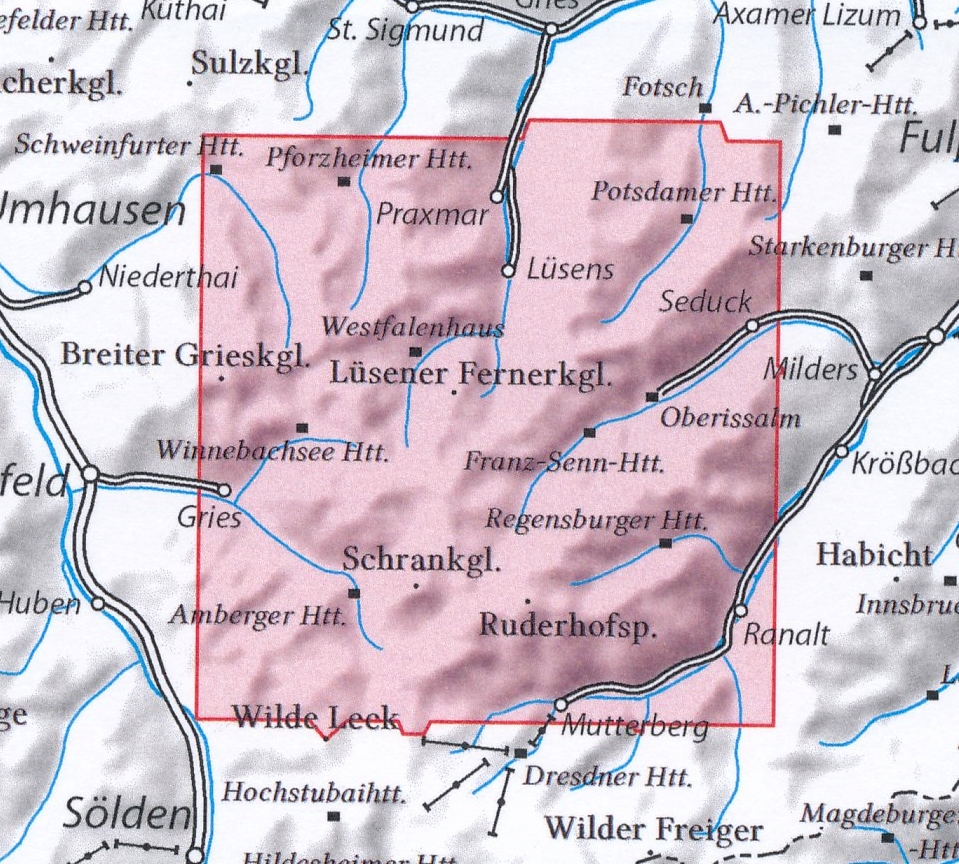 Praxmar, Potsdamer Hütte, Lüsens, Franz-Senn-Hütte, Winnebachsee Hütte, Regensburger Hütte, Westfalenhaus, Oberissalm, Pforzheimer Hütte, Ruderhofspitze