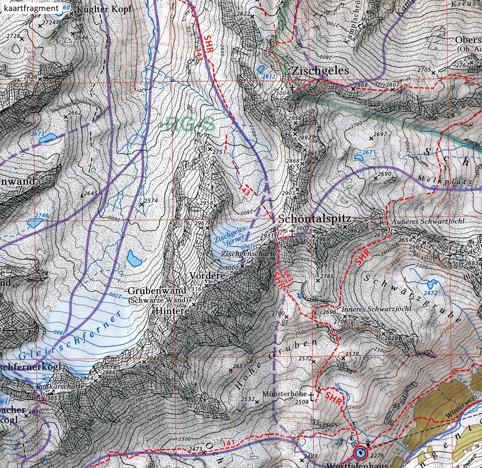 Gedetailleerde wandelkaart / bergsportkaart van de omgeving van de centrale Stubaier Alpen.