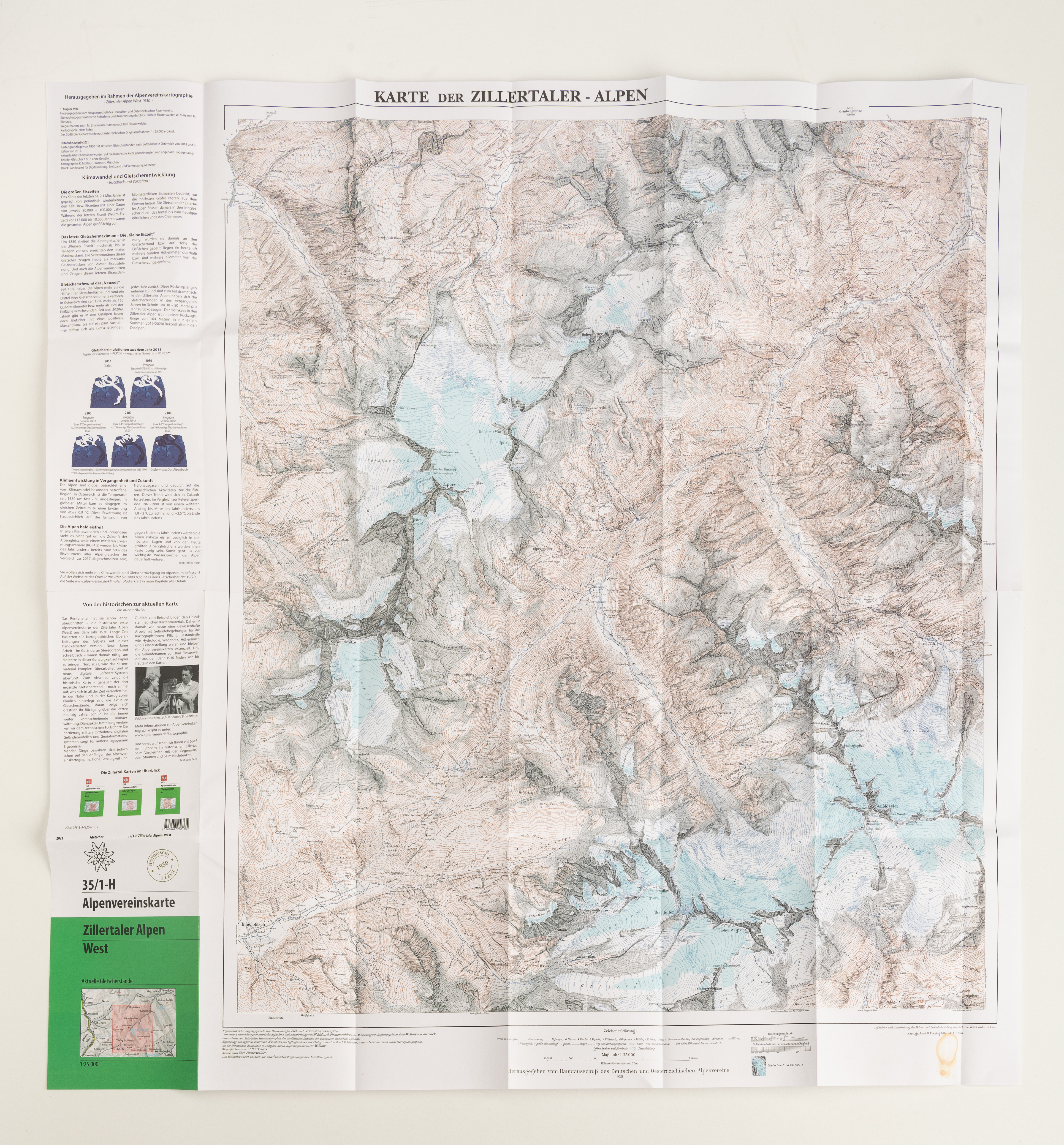 Hij is al heel oud, deze eerste Alpenvereinskaart van de Zillertaler Alpen West uit 1930. Op deze bewerkte kaart worden de gletsjerniveaus getoond van toen in exacte vergelijking met die van nu, en dus hun drastische teruggang. Bovendien slaat de kaart een brug naar de technische verworvenheden in de cartografie van de laatste jaren.