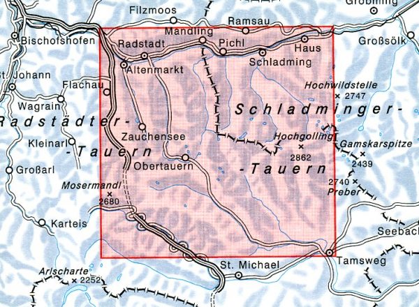 Gedetailleerde wandelkaart / bergsportkaart van de omgeving van de Niedere Tauern / omgeving Schladming, oostelijke Radstädter Tauern.