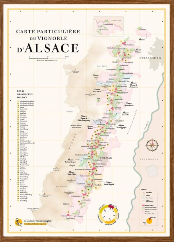 De perfecte poster voor de liefhebbers van de wijnen van de Elzas. Een gedetailleerde kaart met alle Elzasser appellations! Presentatie van de druivensoorten en de verdeling rood/wit in elke regio.