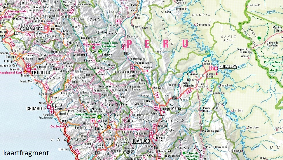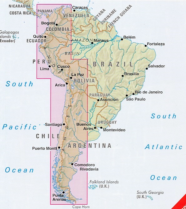 Deel uit een serie overzichts-/ wegenkaartenkaarten, met een mooie en betrouwbare cartografie. Aanduiding van plaatsen, wegen, reliëf d.m.v. schaduwing, nationale parken en symbolen voor toeristische bezienswaardigheden. Plattegronden van de hoofdplaatsen. Dubbelzijdig bedrukt, dus gering volume en gewicht. Geen plaatsnamenregister. Met speciale kaarten van: omgeving Santiago 1 : 800.000, Cusco / Machu Picchu 1 : 1.000.000. Stadsplattegronden: Antofagasta 1 : 18.000, Arica 1 : 11.100, Central Bogotá 1 : 15.000, Central Lima 1 : 20.000, Central Santiago 1 : 15.000, Iquique 1 : 12.500, La Paz 1 : 18.000, La Serena 1 : 8.000, Quito 1 : 20.000.