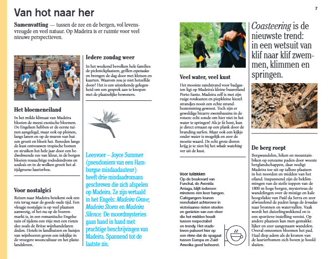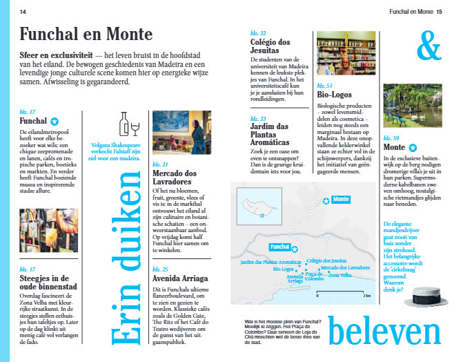 Verken Madeira op een andere manier met de uitgebreide ANWB-reisgids Ontdek Madeira! Natuurlijk mag je bezienswaardigheden zoals de botanische tuin en hetuitkijkterras op de Cabo Girãoniet niet missen. Maar ga ook eens van de gebaande paden en geniet van het uitzicht vanaf de Jezui¨etenkerktoren in Funchal of vaar mee met de Santa Maria, een replica van het schip waarmee Columbus naar Amerika voer.