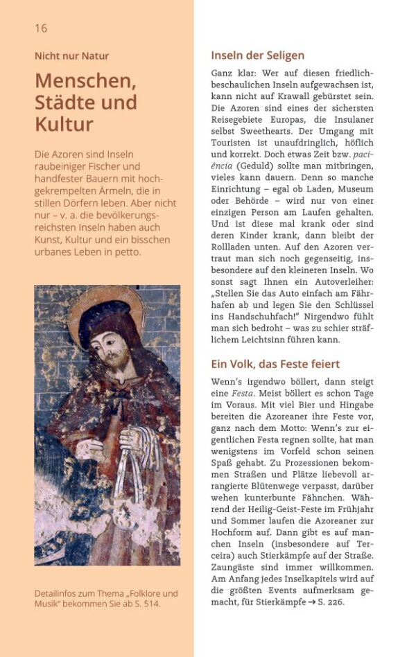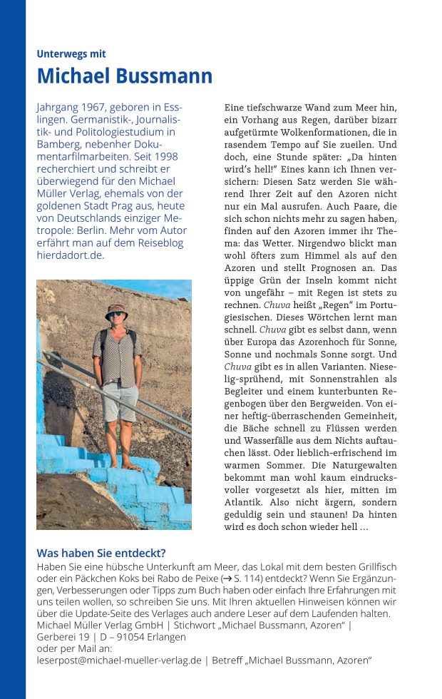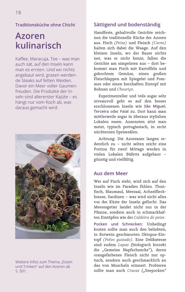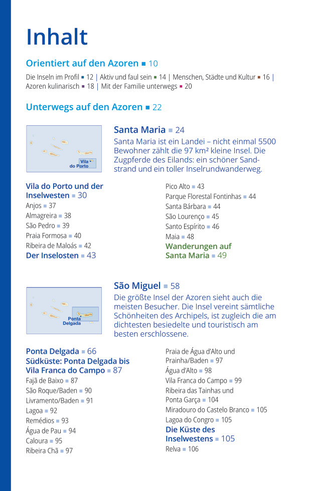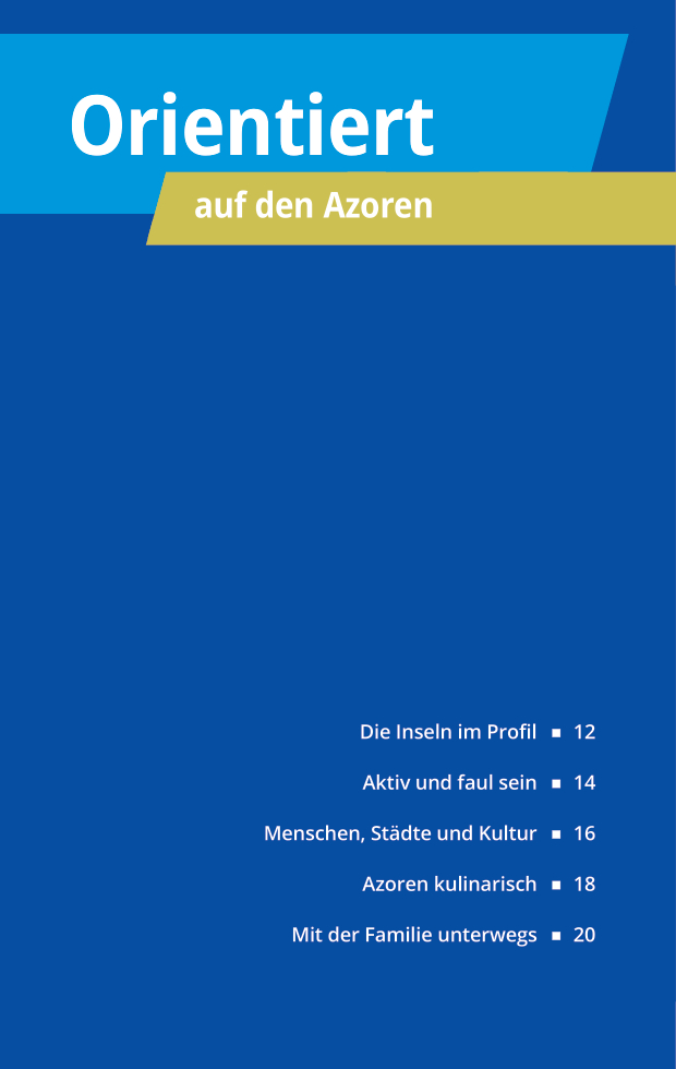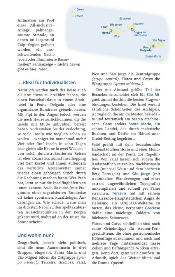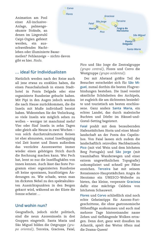 Deze uitgebreide en voortreffelijke gids biedt een ruime selectie goed doordachte reistips voor een vakantie naar de Azoren, gelardeerd met vele kleurenfoto’s overzichtskaarten en stadsplattegronden. Het bevat wandelingen en tips voor overige buitenactiviteiten. Het geeft daarnaast onderhoudende en informatieve achtergrondverhalen over land en volk. Tenslotte vindt u er weloverwogen selecties in, qua overnachtingsaccommodatie zoals hotels, bed & breakfast en campings en overige service-informatie.