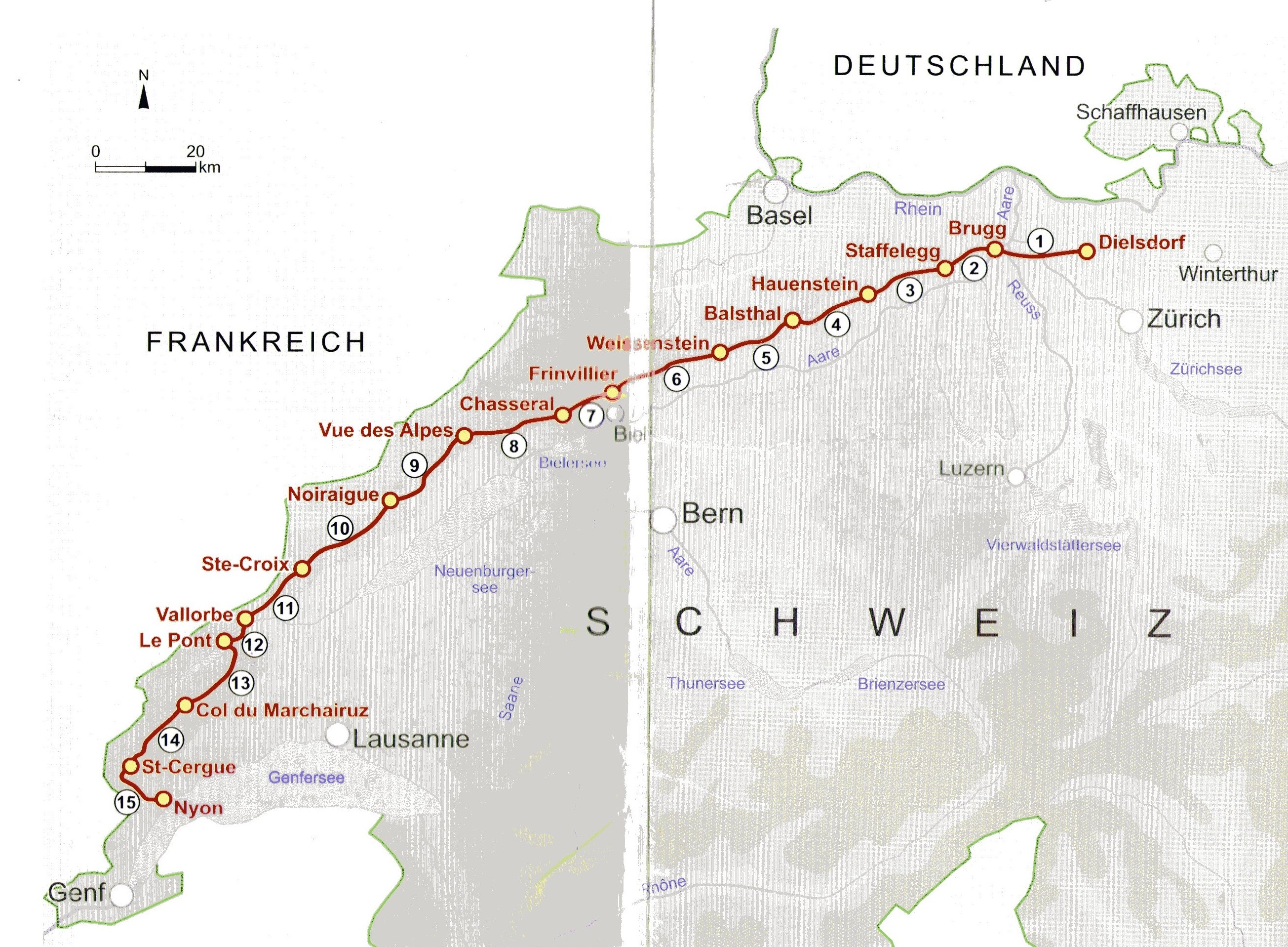 Van Dielsdorf bij Zürich via Aarau, Solothurn, Neuchâtel naar Nyon bij Genève. 310 km in 15 etappes. | In angenehmer Höhe wandernd geniesst man ein umfassendes Panorama und erlebt abwechslungsreiche Landschaften und Kulturräume - von Dielsdorf in 15 Etappen nach Nyon. Die offiziellen Routenführer sind mit Farbfotos, Karten und Höhenprofilen farbig illustriert. Mit beschreibenden Texten und praktischen Informationen zu jeder Etappe.
