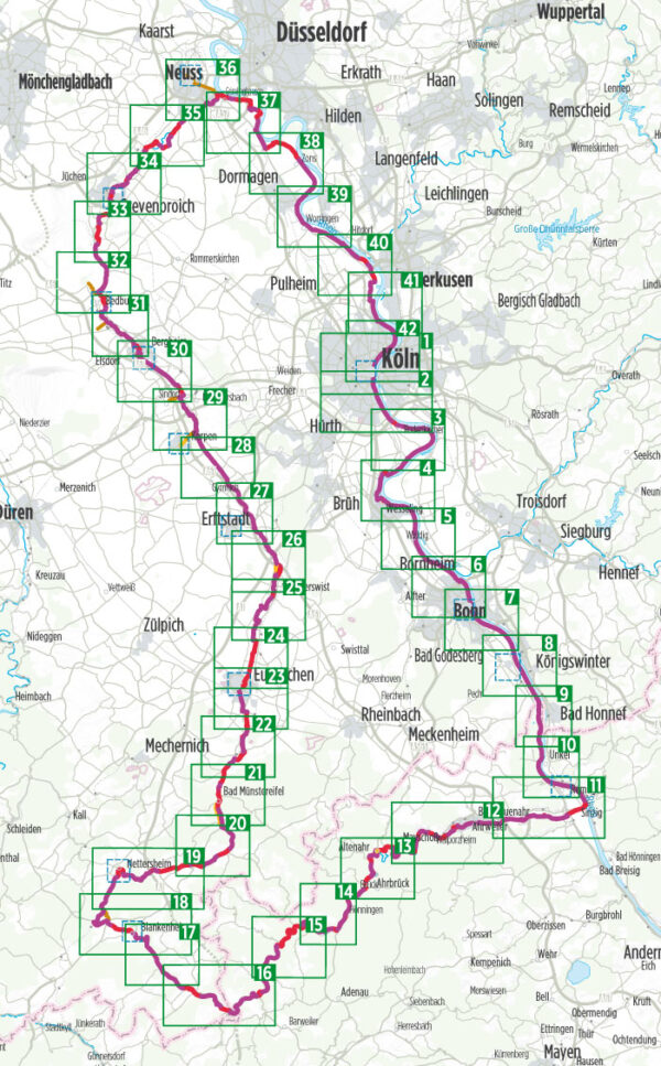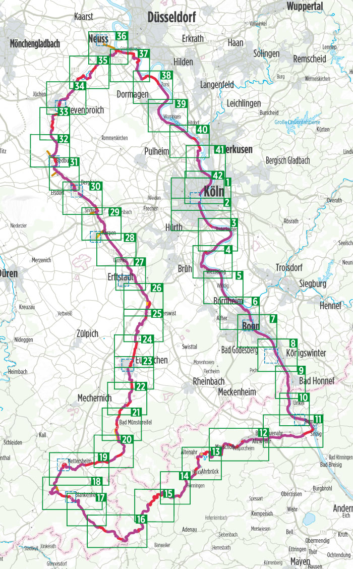 Diese Radrundtour kombiniert die Radwege entlang des Rheins, der Ahr und der Erft. Rheinabwärts folgen Sie den Schildern der EuroveloRoute 15 durch die Großstädte Köln und Bonn nach Remagen. Hier führt die Tour nach Westen ins idyllische Ahrtal. Den Weg weisen die Schilder des Ahr-Radweges, der in Blankenheim endet. Über Blankenheimerdorf erreichen Sie den Bahnhof Blankenheim und radeln weiter entlang der Urft zur Erftquelle in Holzmülheim. Ab hier begleiten Sie die Schilder des Erft-Radweges bis zur Mündung in den Rhein bei Neuss. Rheinabwärts führt die Route zurück nach Köln.