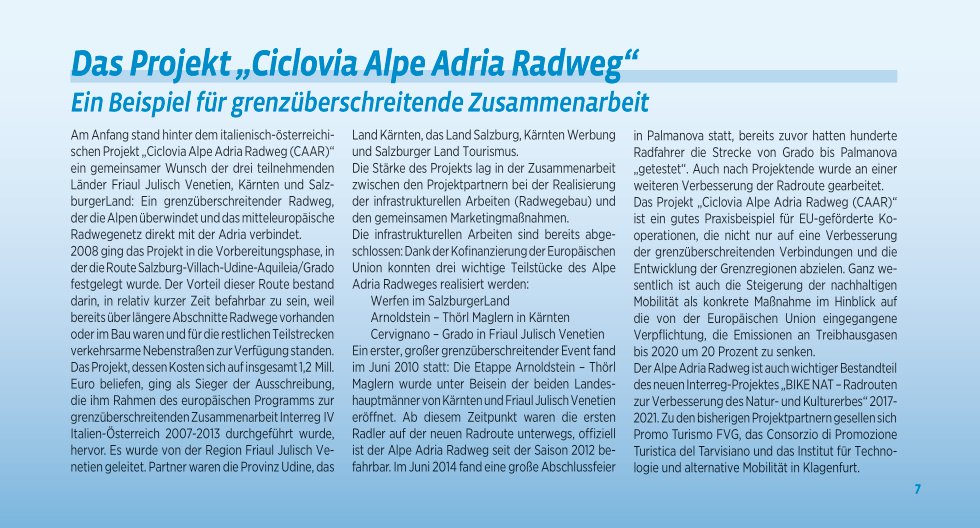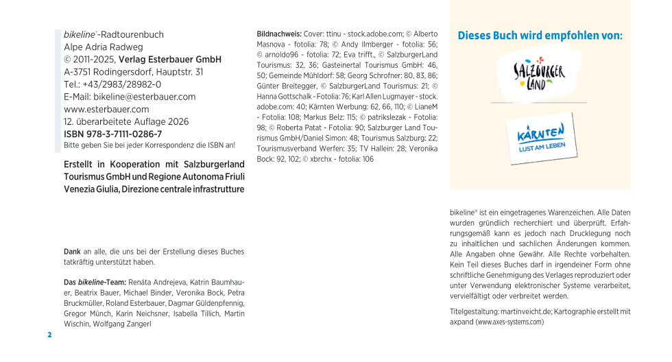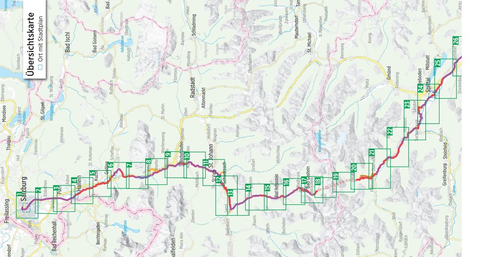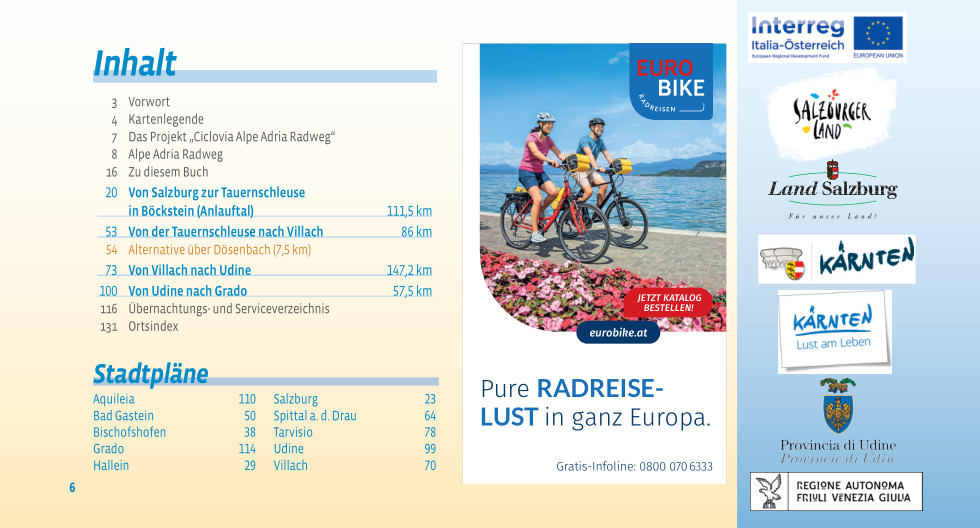 Deel uit een serie praktische duitstalige fietsroutegidsjes in handig formaat met spiraalbinding. De gidsjes bevatten gedetailleerde kaartjes met de route, routebeschrijving, bezienswaardigheden (en overnachtingsmogelijkheden bij de meerdaagse routegidsen). *** Die Route verbindet die Mozartstadt Salzburg mit Grado an der Adria. Auf rund 400 Kilometern durch das Land Salzburg, Kärnten und die Region Friaul Julisch Venetien begegnet Ihnen zahlreiche Naturschauspiele und kulturelle Highlights.