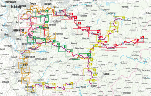 Praktisch fietsroutegidsje in handig formaat, met spiraalbinding. Deze Duitstalige boekjes bevatten gedetailleerde routekaarten, routebeschrijving, bezienswaardigheden (en overnachtingsmogelijkheden bij de meerdaagse routegidsen) en een code om de bijbehorende GPS-tracks vanaf de site te downloaden. Das Bergische Land, die Region zwischen Köln, Düsseldorf und dem Ruhrgebiet lässt sich bequem ohne größere Anstiege auf Fluss- und Bahntrassen-Radwegen erschließen. Auf dem sehr gut ausgebauten und beschilderten Radwegenetz können Sie die bergische Landschaft mit den sanft geschwungenen Hügeln, den beschaulichen Tälern, den grünen Wäldern und Wiesen, den Talsperren und den typisch bergischen Orten und Städten mit dem Fahrrad erkunden. Das abwechslungsreiche Gebiet erstreckt sich im Norden zur Ruhr und im Süden ins Siegtal sowie im Westen zum Rhein und im Osten bis ins Sauerland. Die in diesem Buch vorgestellten Radtouren lassen sich vielfach variieren. So können Sie z. B. aus einzelnen Abschnitten kleine Rundtouren zusammenstellen oder auch zwei oder mehrere Radwege miteinander kombinieren um einen längeren Besuch in der Region zu planen. ie Gesamtlänge der in diesem Radtourenbuch vorgestellten Touren beträgt ca. 550 Kilometer. Die längsten Radtouren sind die etwa 145,5 Kilometer lange Lenneroute und der Bergische Panorama-Radweg mit einer Länge von ca. 132,5 Kilometern. Bei der kürzesten Route, dem Panorama-Radweg Niederbergbahn, radeln Sie auf einer Strecke von ca. 40,5 Kilometern. Desweiteren gibt es Varianten und Auflüge mit insgesamt 127 Kilometern.