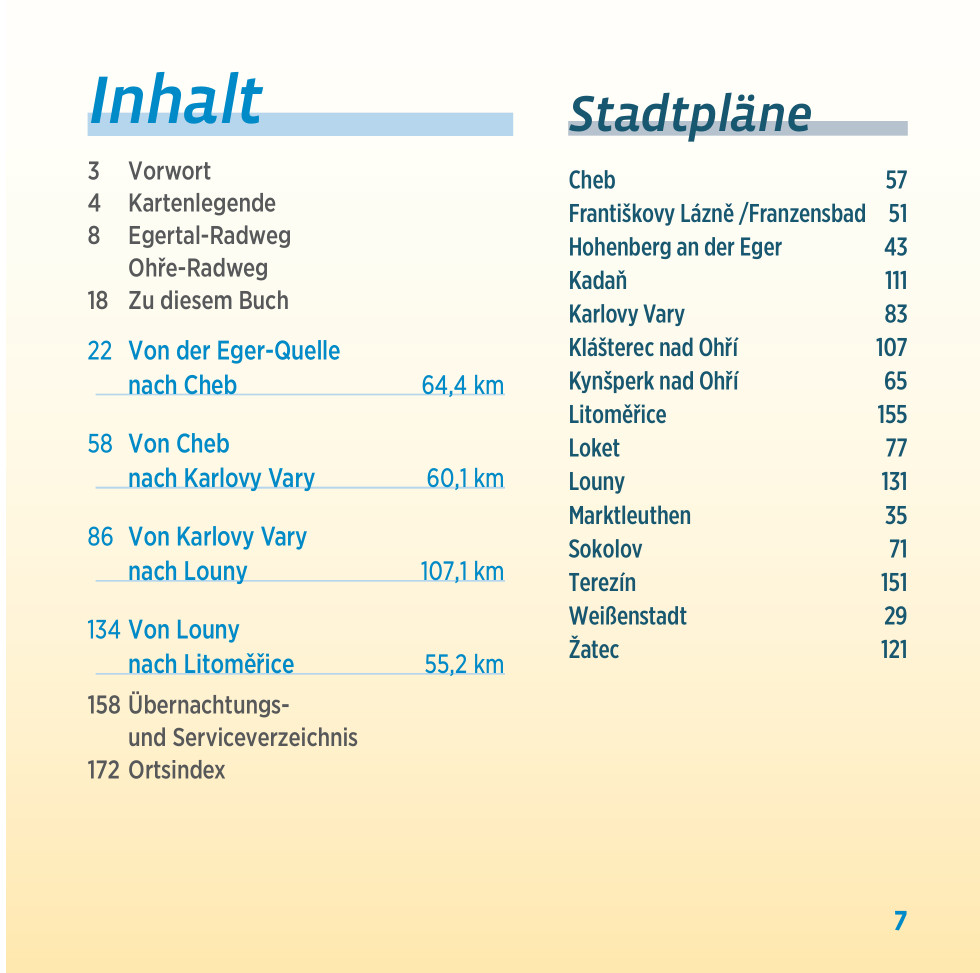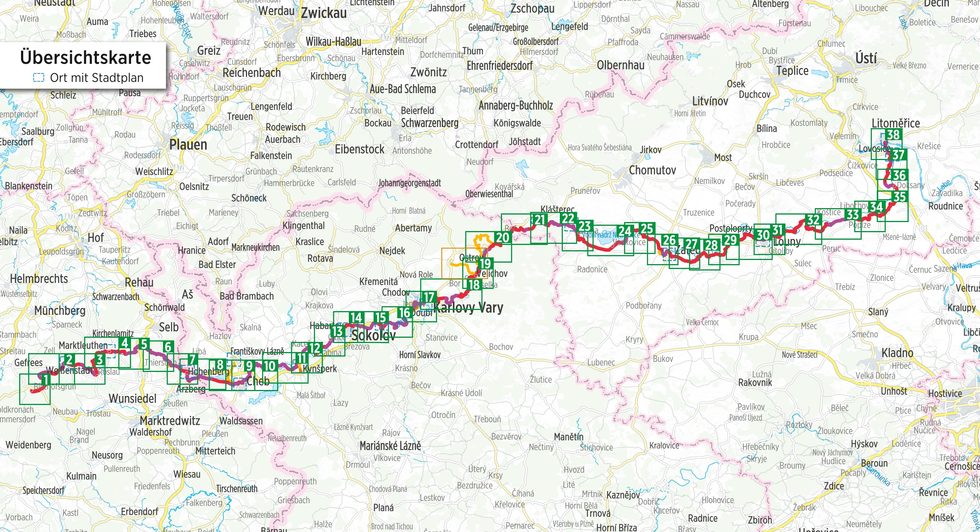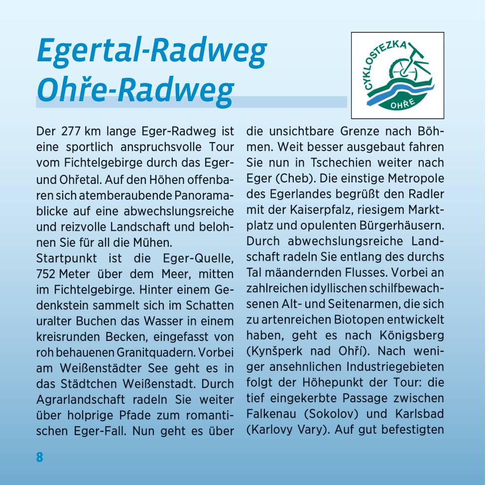 Uitgangspunt is de Egerbron (D), 752 meter boven de zeespiegel, in het midden van het Fichtelgebergte. Door het agrarische landschap fietst u geleidelijk oostwaarts, over hobbelige paden naar de romantische Eger-Fall. De voormalige metropool Cheb verwelkomt de fietser met het keizerlijk paleis, de grote markt en de weelderige herenhuizen. Je fietst door een gevarieerd landschap langs de rivier die door de vallei slingert. Via talrijke idyllische met riet bedekte oude en zijarmen, die zich tot soortrijke biotopen hebben ontwikkeld, gaat de route naar Königsberg (Kynšperk nad Ohrí). Na minder aantrekkelijke industriegebieden volgt het hoogtepunt van de tocht: de diep ingekerfde doorgang tussen Falkenau (Sokolov) en Karlovy Vary. Op goed geasfalteerde natuurlijke paden volgt u de waterloop urenlang. In het pittoreske Karlovy Vary (Karlsbad), het grootste kuuroord van Tsjechië, kunt u zich ontspannen en de klassieke architectuur bewonderen.