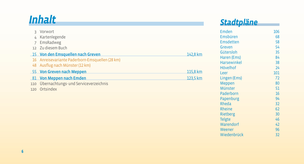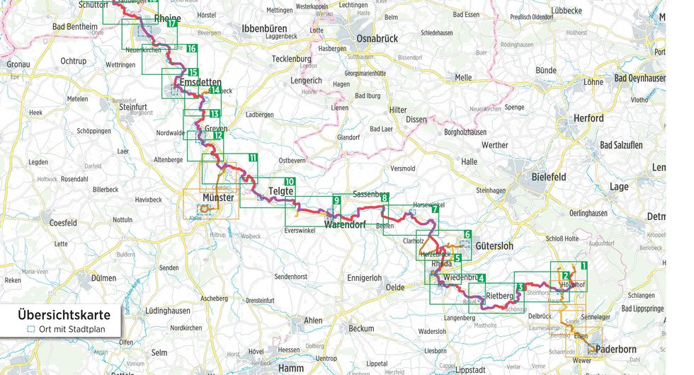 Paderborn/Dortmund Muenster Emden; 379 km PB Emden, tak vanaf Dortmund. Deel uit een serie praktische duitstalige fietsroutegidsjes in handig formaat met spiraalbinding. De gidsjes bevatten gedetailleerde kaartjes met de route, routebeschrijving, bezienswaardigheden (en overnachtingsmogelijkheden bij de meerdaagse routegidsen). *** Eine Reise mit Weitblick erwartet Sie auf dieser Radtour durch das fruchtbare Münster- und Emsland in Richtung Norden. Weite Ebenen, typische Fachwerkhäuser, saftige Wiesen und schmucke Städtchen laden Sie zu dieser Radtour bis zur Nordsee ein.
