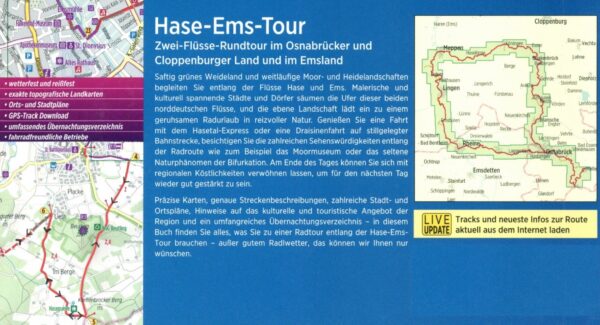 Deel uit een serie praktische duitstalige fietsroutegidsjes in handig formaat met spiraalbinding. De gidsjes bevatten gedetailleerde kaartjes met de route, routebeschrijving, bezienswaardigheden (en overnachtingsmogelijkheden bij de meerdaagse routegidsen). *** Saftig grünes Weideland und weitläufige Moor- und Heidelandschaften begleiten den Radler entlang der Flüsse Hase und Ems. Kulturell spannende und malerische Städte und Dörfer säumen die Ufer dieser beiden norddeutschen Flüsse und die ebene Landschaft lädt ein zu einem geruhsamen Radurlaub in reizvoller Landschaft.