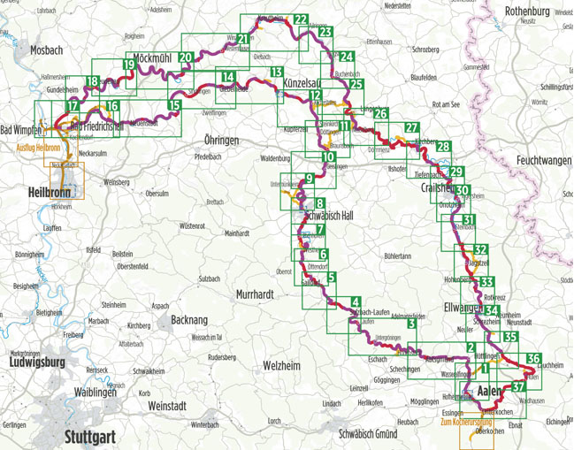 Kocher en Jagst - twee idyllische riviertjes in het noorden van Baden-Württemberg, omgeven door een symfonie van weiden en bossen, velden en akkers, mooie dorpjes en historische steden, romantische kastelen en prachtige paleizen. Deze dromerige plek ligt in het gebied tussen de Neckar, het Hohenloher Land en de Schwäbische Alb. De beste manier om deze regio te ontdekken is op de fiets over het Kocher-Jagst fietspad. Met een totale lengte van ongeveer 336 kilometer is deze rondweg inmiddels ook bekend onder de vele liefbhebbers van rivierfietspaden, maar hij is niet overvol en daarom bijzonder aan te bevelen. Laat je verrassen door de regio rond de tweelingrivieren Kocher en Jagst!