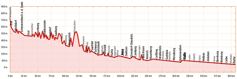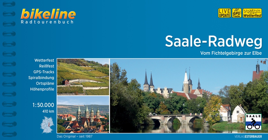 Die Reise entlang der Saale führt durch die Wälder Oberfrankens und Thüringens, vorbei an großen, fjordartigen Talsperren und durch stille, „verschieferte“ Dörfer. Städte wie Jena, Naumburg und Halle sowie die vielen Burgen und Schlösser am Wegesrand erzählen ruhmreiche saalische Geschichten. Exoten wie das nördlichste Weinbaugebiet Saale-Unstrut oder das längste Gradierwerk in Europa bereichern den weiteren Weg des Flusses, an dessen Ufer sich der Saale-Radweg auf etwa 420 Kilometern von der Quelle der Saale im Fichtelgebirge bis zur Mündung in die Elbe erstreckt.