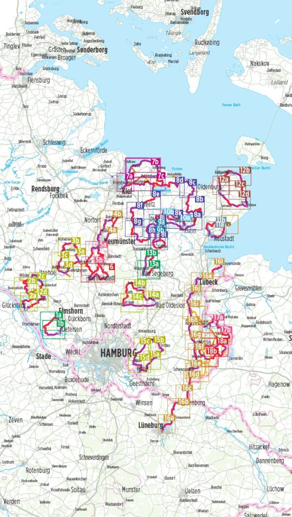 Deel uit een serie praktische duitstalige fietsroutegidsjes in handig formaat met spiraalbinding; gedrukt op scheur- en watervast materiaal. De gidsjes bevatten gedetailleerde kaartjes met de route, routebeschrijving, bezienswaardigheden (en overnachtingsmogelijkheden bij de meerdaagse routegidsen). | In diesem Buch haben Sie die Wahl zwischen den beiden Mehrtagestouren Alte Salzstraße und Holsteinische Schweiz-Radtour oder 16 verschiedenen Tagestouren, die auf das ganze Gebiet zwischen Elbe, Ostsee und der Grenze zu Mecklenburg-Vorpommern verteilt sind. Das heißt also, dass es sowohl Touren an der Ostseeküste gibt wie auch in den Hügeln der holsteinischen Schweiz, im Naturpark Lauenburgische Seen oder in Elbnähe in der Haseldorfer Marsch. Die Rundtour in der Holsteinischen Schweiz führt von der Rosenstadt Eutin zur höchsten Erhebung des Landes, dem Bungsberg, aber auch an die Ostsee und zum weißen Schloss von Plön.Etwas südlicher, von Lüneburg nach Lübeck, verläuft die Tour entlang des mittelalterlichen Handelsweges „Alte Salzstraße“, die auf bestens ausgebauten Radwegen entlang des Elbe-Lübeck-Kanals verläuft. Und wer mag, kann all diese Touren auch gerne kombinieren oder Teilstücke davon fahren – denn durch das ausgezeichnete Bahnnetz und spezielle Radlerangebote ergibt sich eine Vielzahl an Möglichkeiten (genaue Infos dazu zu Beginn jeder Tour).