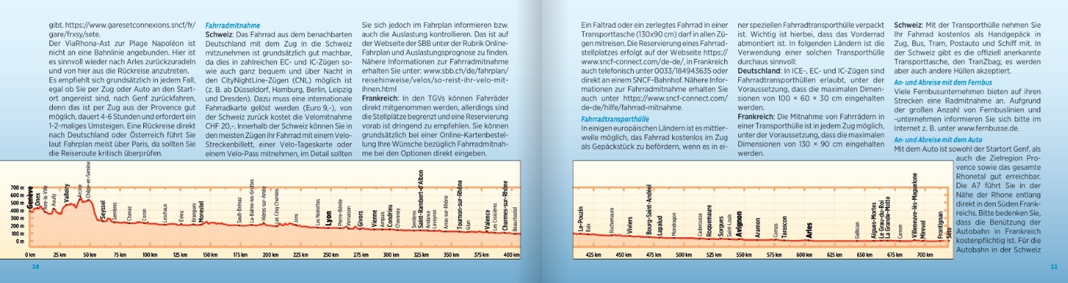Praktisch fietsroutegidsje in handig formaat, met spiraalbinding. Deze Duitstalige boekjes bevatten gedetailleerde routekaarten, routebeschrijving, bezienswaardigheden (en overnachtingsmogelijkheden bij de meerdaagse routegidsen) en een code om de bijbehorende GPS-tracks vanaf de site te downloaden. | In der Schweiz im Kanton Wallis am Rhonegletscher liegt der Ursprung des Flusses Rhone, der gut 800 Kilometer weiter südlich in der Camargue ins Mittelmeer mündet. Entlang des Flussverlaufs liegen viele verschiedene Landschaften und eine Jahrtausende währende, ereignisreiche Geschichtsschreibung.Apropos Schreibung: die Rhone hat viele verschiedene Namen. Bei den Griechen hieß der Fluss Rhodanos, bei den Römern analog dazu Rhodanus. Neben den kaum bekannten Bezeichnungen Rôno (arpitanisch) und Ròse (okzitanisch) finden Sie in den Karten durchaus immer wieder die Bezeichnung Rotten. Das ist der ursprünglich deutschsprachige Name, der heute aber nur noch im Oberwallis offiziell verwendet wird. Interessant ist auch, dass alle diese Bezeichnungen mit dem männlichen Geschlecht verwendet werden, auch das französische Rhône und das veraltete Rotten – nur die heutige deutsche Bezeichnung Rhone gibt dem Fluss einen weiblichen Touch.Beeindruckend ist der Flusslauf der Rhone allemal mit seinen alpinen Wurzeln und der sonnenreichen Landung im Mittelmeer. Zwar startet die französische ViaRhôna im schweizerischen Genf, die Grenze zu Frankreich ist aber bald erreicht. Der Fluss fließt hier dem französischen Jura folgend anfangs nach Süden und durchbricht dann in westlicher Richtung den Gebirgszug, um sich in Lyon dann endgültig gen Süden auszurichten. Nun weitet sich das Tal und die lieblicheren Weinregionen lösen die raueren Gebirgslandschaften ab. Bekannte Weinbaulandschaften wie Côtes du Rhône lassen das Genießerherz höher schlagen, bevor die unendlichen Weiten der Camargue dem Fluss das letzte Geleit bis ins Mittelmeer geben.An den Ufern der Rhone erwartet Sie eine Symphonie aus Natur, Kultur und kulinarischen Erlebnissen, die ihresgleichen sucht. Lassen Sie sich verzaubern von typisch französischen Dörfern, charakteristischen Ortskernen, kulturbeladenen Städten, hervorragenden Gaumengenüssen, spannenden Wassersportaktivitäten und erholsamen Flussauen-Landschaften. Und das Ganze mit einer schon über die Hälfte fertiggestellten Radroute, die mit perfekt ausgebauten Radwegen aufwarten kann.Ganz im Süden in Avignon gibt es in der offiziellen Planung der ViaRhôna eine Verzweigung. Der Ast direkt nach Süden nach Port-Saint-Louis-du-Rhône ist in diesem Buch beschrieben. Ein anderer Zweig der ViaRhôna führt von Avignon in den westlichen Teil der Camargue und schlussendlich bis nach Montpellier. Der Ausbauzustand dieses Streckenstückes ist noch in den Anfängen, daher haben wir vorerst darauf verzichtet, diesen Abschnitt ins Buch mit aufzunehmen. Nähere Informationen dazu finden Sie auf der ViaRhôna-Webseite.