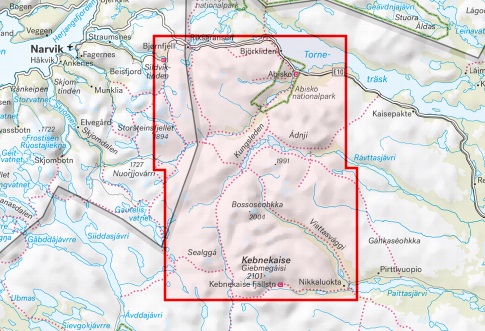 Deze kaart bestrijkt de meest noordelijke en populaire route tussen Abisko en Kebnekaise/Nikkaluokta, maar het gedeelte omvat ook het hele berggebied tussen Abisko en Riksgränsen en de Nordkalottleden bij Unna Allakasstugorna.