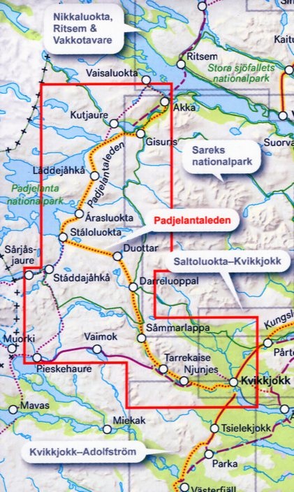 Deze kaart is speciaal ontwikkeld voor de intekening van de Padjelantaleden. De kaart bestrijkt de hele route tussen Ritsem in het noorden tot Kvikkjokk in het zuiden, via klassieke berghutten bij Ákka en Staloluokta. Het omvat ook de Nordkalottleden-route tussen Stáddájåhkå en Tarradalen, via Vaimokstugan.
