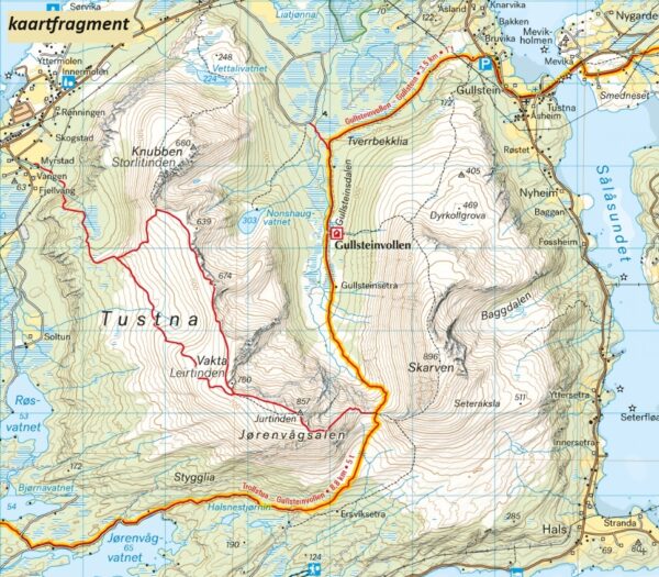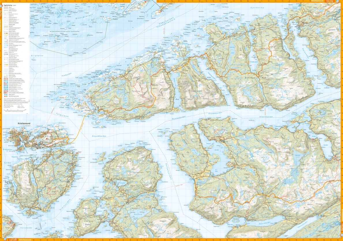 Fjordruta is een van de mooiste langeafstandswandelingen van Noorwegen van ongeveer 154 kilometer, verdeeld in 12 dagelijkse etappes rond de Vinjefjord in Nordmøre. De tocht volgt de gemarkeerde routes van de toeristenbond met accommodatie in zelfbedienings-DNT-hutten. Dit dubbelzijdige kaartblad beslaat het hele traject van Kristiansund naar Halsa.