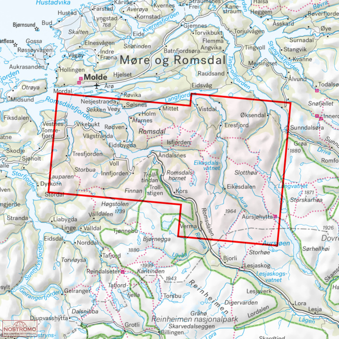 Scheurvaste, dubbelzijdig bedrukte kaart met het gebied rondom de Romsdalfjord en het Eikesdalmeer, met veel prachtige wandelbestemmingen. De kaart maakt deel uit van de moderne kaartenreeks van Calazo, met unieke terreininformatie op basis van laserscanning vanuit vliegtuigen en betere nauwkeurigheid in de details. Onder andere gedetailleerde luchtfoto's zijn gebruikt om alle paden in de omgeving te corrigeren. Ook zijn hierdoor veel routes geïdentificeerd en toegevoegd die ontbraken in de officiële databases.