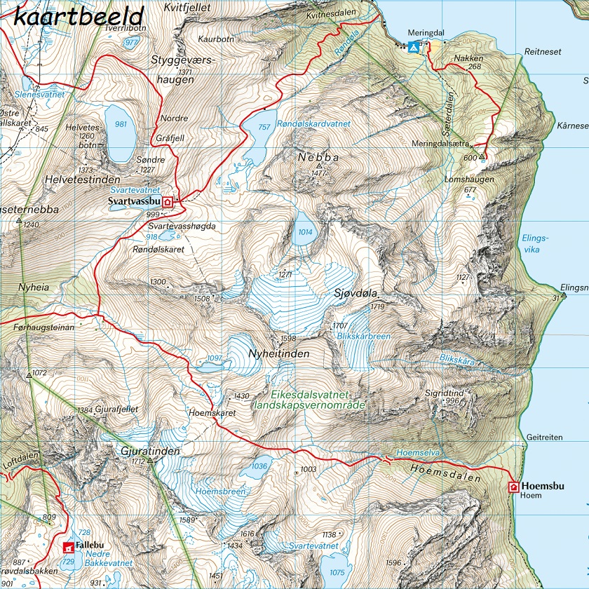 De kaart beslaat alle populaire bergwandelgebieden, met hutten die zowel door DNT als door andere exploitanten worden beheerd. Gemarkeerde wandelroutes in de omgeving staan erop en bovendien is de kaart daarnaast prima geschikt voor gebruik in de winter: het toont alle gemarkeerde winterroutes en geprepareerde skipistes.