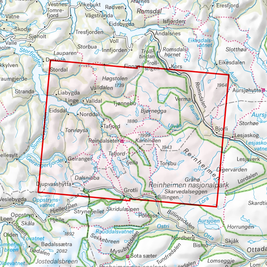 Tafjordfjella en Reinheimen vormen samen een van de grootste ongerepte hooggebergtegebieden in Zuid-Noorwegen en een leefgebied voor wilde rendieren. Hier zijn klassieke wandelbestemmingen zoals Reindalseter, Pyttbua en Puttegga (1999 m).