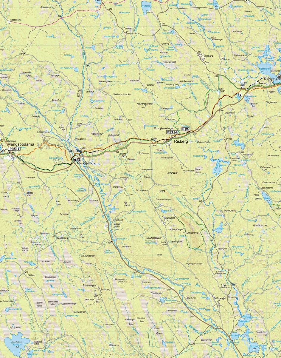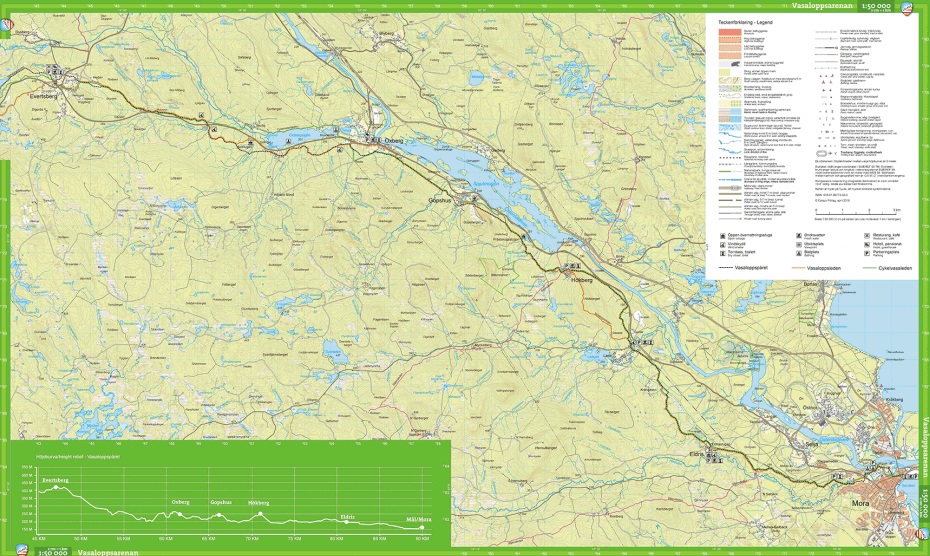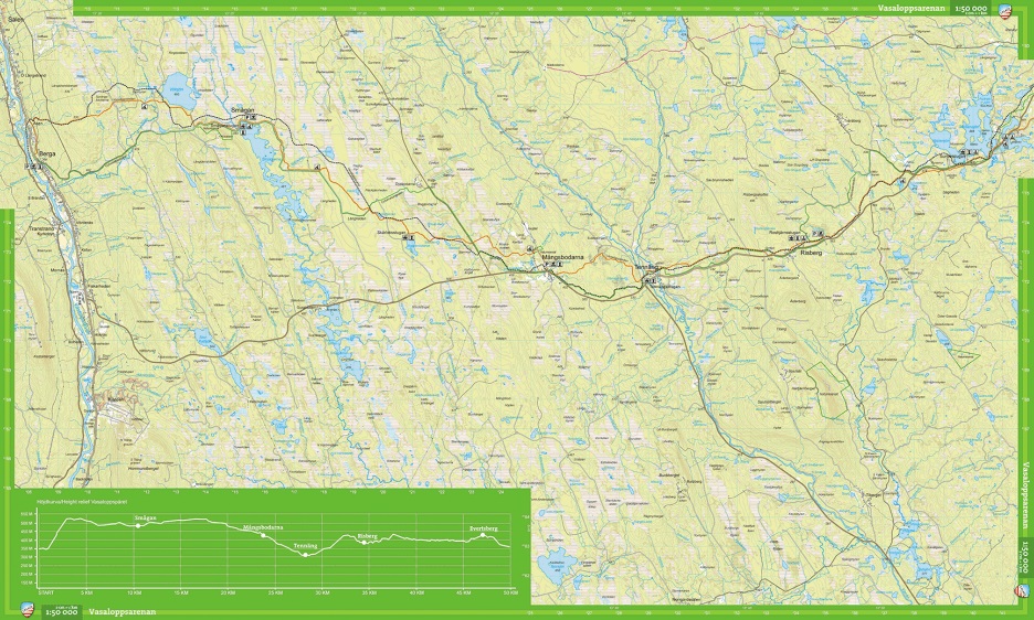 Dit is een speciale kaart die de drie verschillende paden laat zien die tussen Sälen en Mora lopen: Cykelvasanleden, Vasaloppsspåret enVasaloppsleden. De kaart is een terreinkaart op schaal 1:50.000 waarop deze paden zijn aangegeven. Deze routes zijn gemarkeerd en het hele jaar door toegankelijk voor het publiek, met hutten om in te overnachten, etc. De kaart is bijzonder gedetailleerd en gedrukt op het onverwoestbare tyvek.