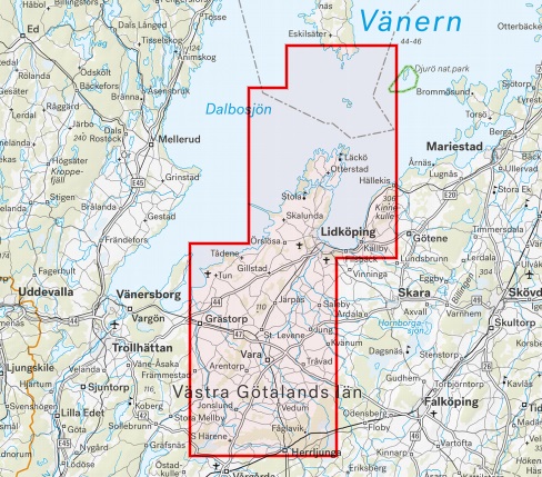 Deze mooie gedetailleerde wandelkaart bestrijkt de wijde omgeving van Lidköping inclusief de plaatsen Kinnekulle, Kållandsö en het kasteel van Läckö. Op de kaart staat tevens de nieuwe nationale fietsroute Vänerleden, die deels door dit gebied loopt.