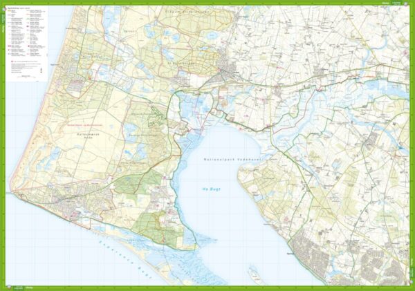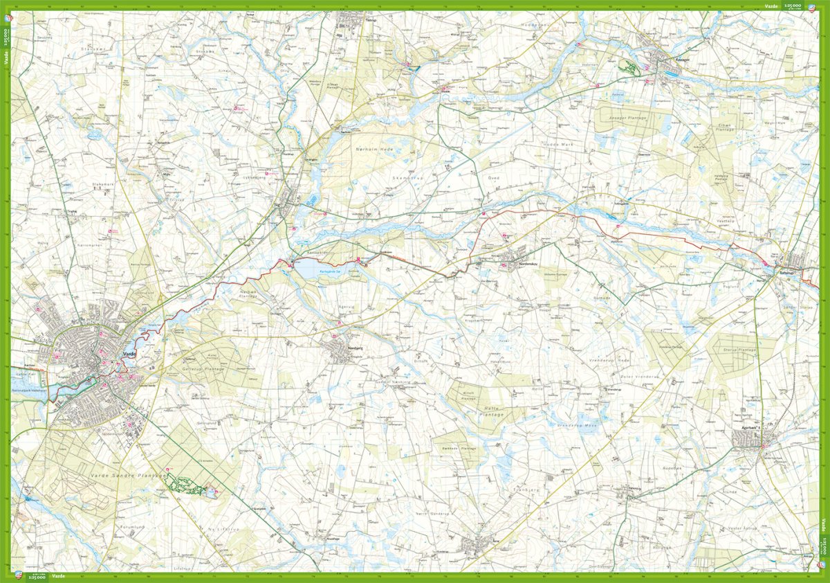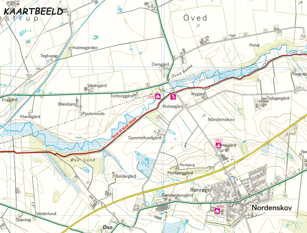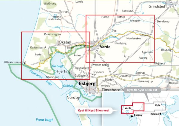 Dit is westelijke kaart uit een set van twee die zijn gemaakt voor de wandelroute 'Kyst til kyst Stien', waarmee de route van 130 km van Blåvand Huk naar Vejle te volgen. Ook andere lokale fiets- en wandelroutes zijn duidelijk op de kaart aangegeven. Daarnaast vind je informatie over gratis kampeerterreinen en tentplaatsen, schuilhutten, parkeerplaatsen, tips voor accommodatie en overnachtingen, enz.