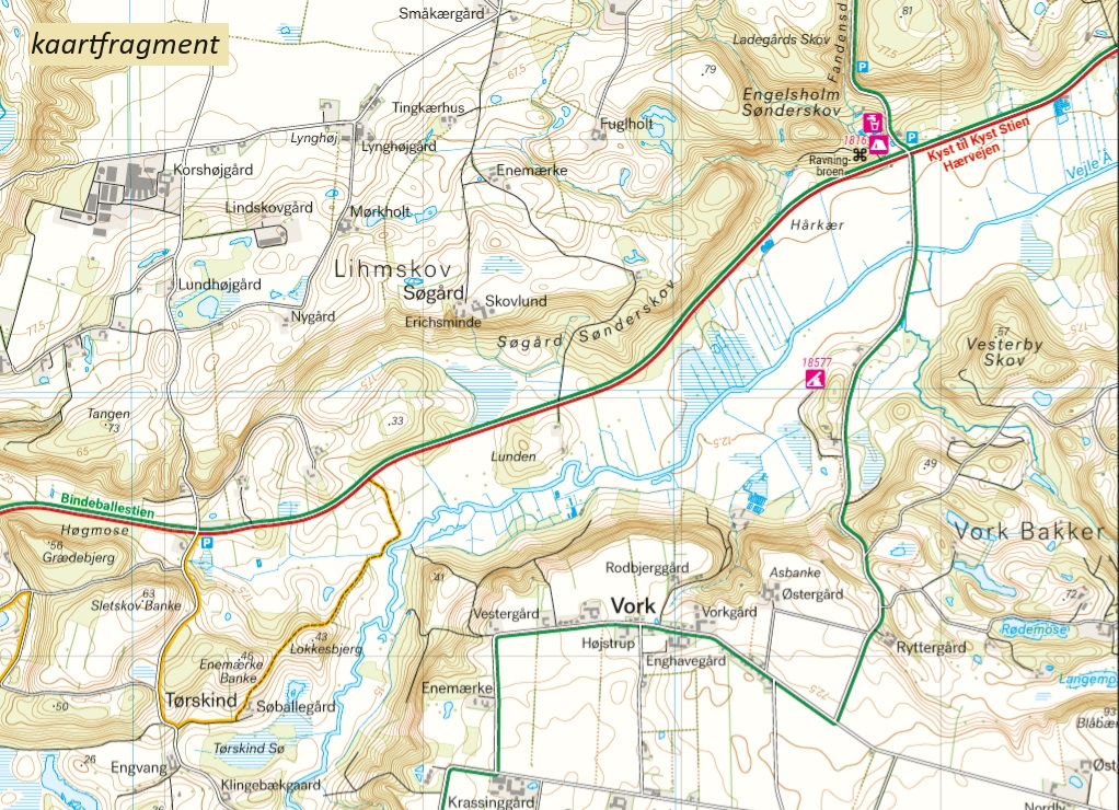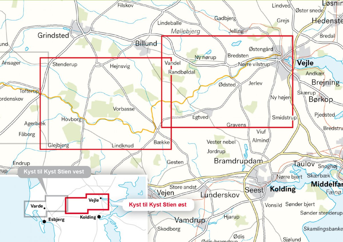 Dit is oostelijke kaart uit een set van twee die zijn gemaakt voor de wandelroute 'Kyst til kyst Stien', waarmee de route van 130 km van Blåvand Huk naar Vejle te volgen. Ook andere lokale fiets- en wandelroutes zijn duidelijk op de kaart aangegeven. Daarnaast vind je informatie over gratis kampeerterreinen en tentplaatsen, schuilhutten, parkeerplaatsen, tips voor accommodatie en overnachtingen, enz.