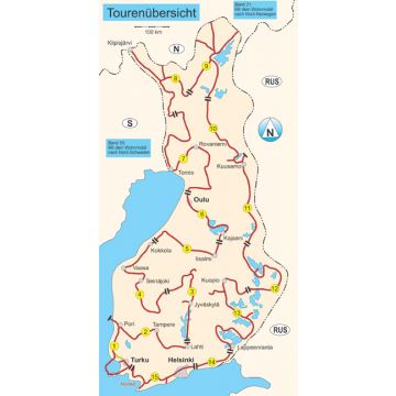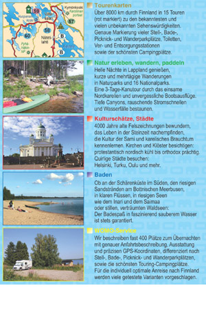 Gids voor het reizen met een camper. Routes, staanplaatsen en toeristische info. Plaatsaanduidingen onder meer m.b.v. nauwkeurige GPS markeringen. *** Routekaarten: over 8000 km door Finland in 15 tochten (rood gemarkeerd) naar de bekendste en meest onbekende bezienswaardigheden. Nauwkeurige markering van vele parkeer-, bad-, picknick- en wandelgebieden, toiletten, voorraad- en afvoerstations en de mooiste campings. Een 3-daagse kanotocht door de eenzame noordelijke wildernissen en onvergetelijke boottochten. Bewonder 4000 jaar oude rotstekeningen, leer de cultuur van de Sami en de Kareliaanse gebruiken kennen en bezoek kerken en kloosters. Bezoek de bruisende steden: Helsinki, Turku, Oulu en meer. Zwemmen in zee kan prima aan de archipelkust in het zuiden, de enorme zandstranden aan de Botnische Golf, in heldere rivieren, in grote meren zoals de Inari en Saimaa of rustige, dromerige bosmeren: zwemplezier in kristalhelder water is altijd gegarandeerd. | WOMO-SERVICE Wij beschrijven meer dan 400 overnachtingsplaatsen met exacte routebeschrijving, uitrusting en precieze GPS-coördinaten, uitgesplitst naar parkeer-, bad-, picknick- en wandelplaatsen, evenals de mooiste toercampings. Voor de individuele optimale reis naar Finland worden vele geteste varianten voorgesteld.