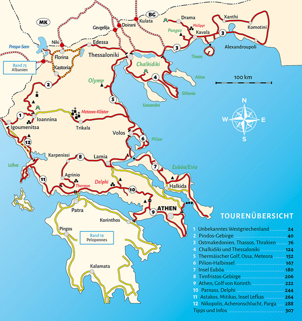 Auf über 5.000 Kilometern und 12 Wohnmobiltouren entdecken Sie Griechenland (ohne Peloponnes). Bestaunen Sie die Wiege unserer Kultur: antike Amphitheater und Tempel, Klöster und frühchristliche Kirchen. Entspannen Sie am Meer, durchwandern Sie die tiefste Schlucht Europas oder baden Sie in berühmten Thermalquellen.