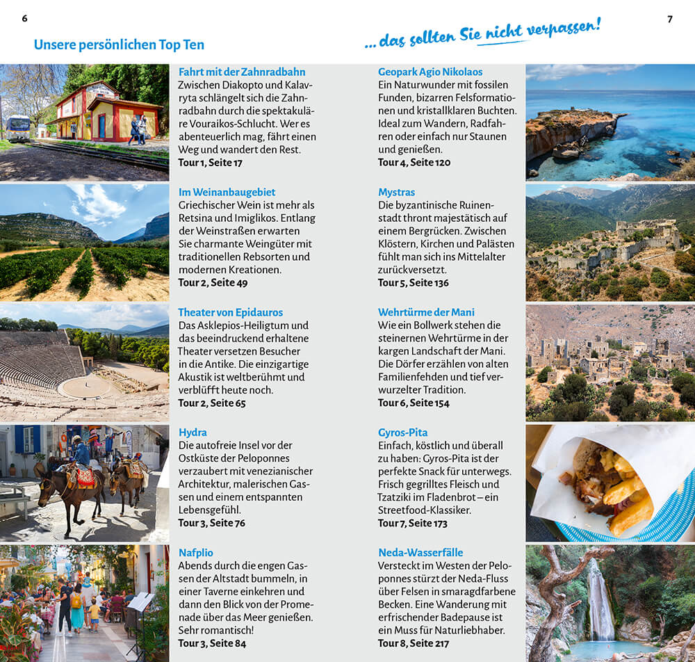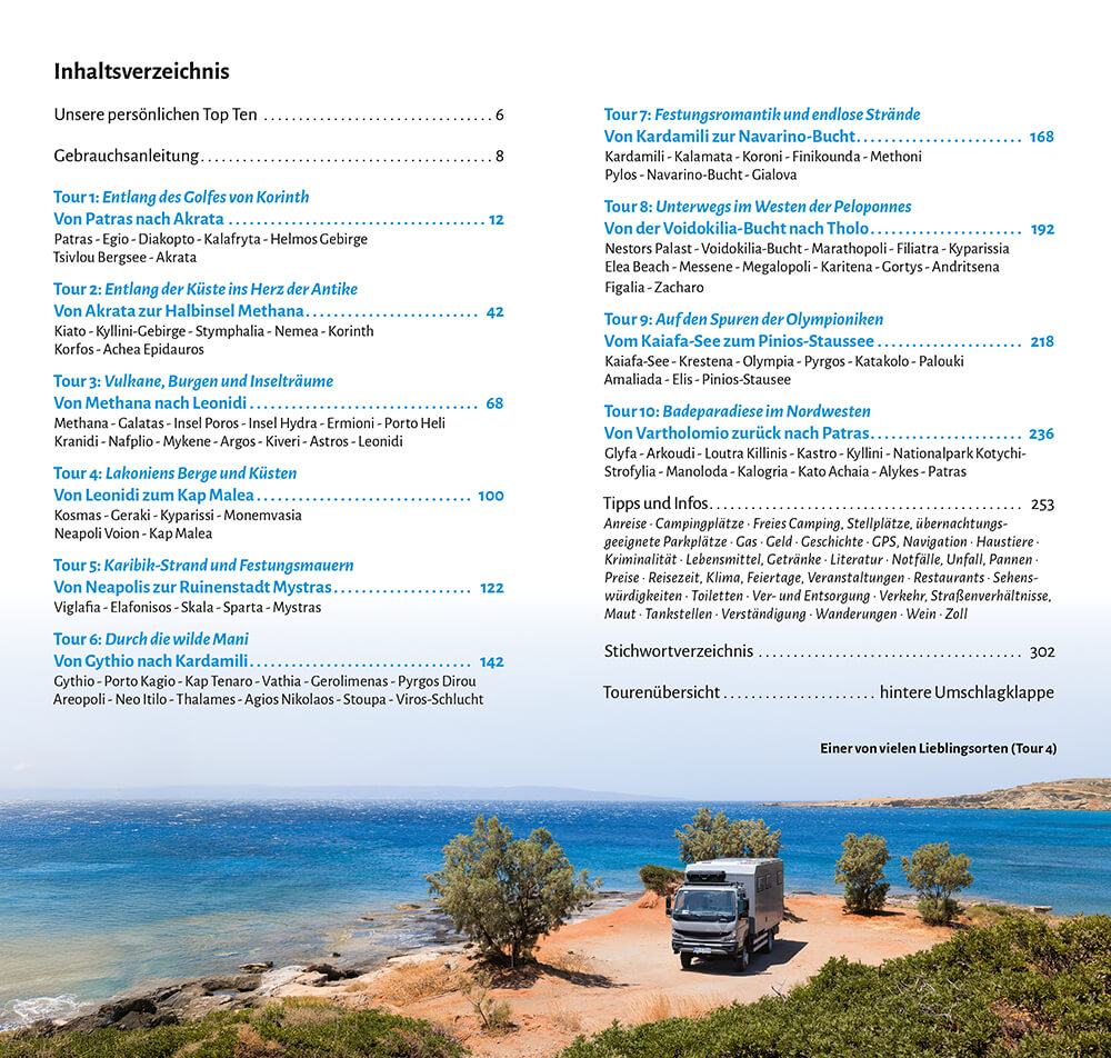 Über 2.900 km Peloponnes in 12 Touren (rot markiert) - zu den bekanntesten und vielen unbekannten Sehenswürdigkeiten. Genaue Markierung vieler Stell- Bade- Picknick- und Wanderparkplätzen, Toiletten, Trinkwasserstellen sowie Campingplätzen.
