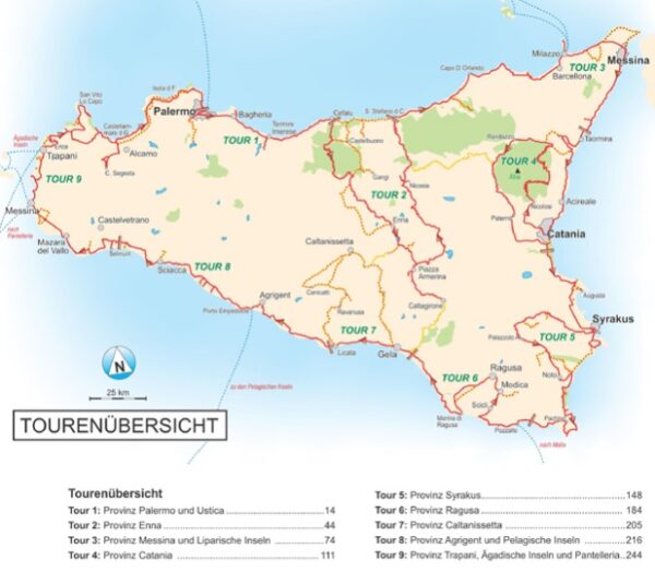 Auf rund 2700 km in 9 Touren zu allen großen Attraktionen und weniger bekannten Orten auf Sizilien reisen. Genaue Markierung freier und offizieller Stell-, Bade-, Picknick-, Wander- und Campingplätze incl. Ausstattung. Vermerk von Museen, Burgen, Kirchen uvm.