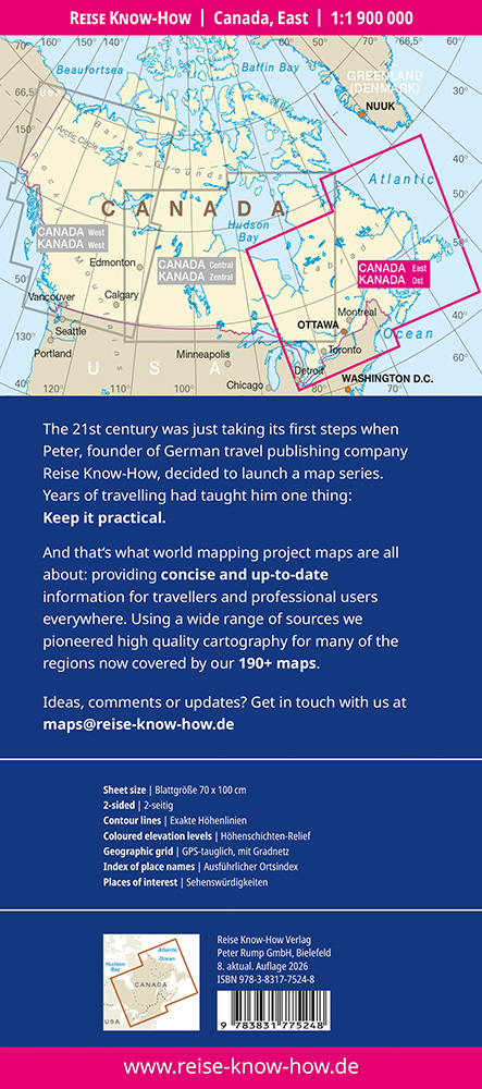 Uitstekende tweezijdig bedrukte wegenkaart / overzichtskaart. Verschenen in de serie van het 'World Mapping Project', van uitgeverij Reise Know How. Met lengte- en breedtegraden (handig voor GPS-gebruik), plaatsnamenindex, hoogtelijnen en enige toeristische informatie. Gedrukt op scheur- en watervast (milieuonschadelijk) materiaal.