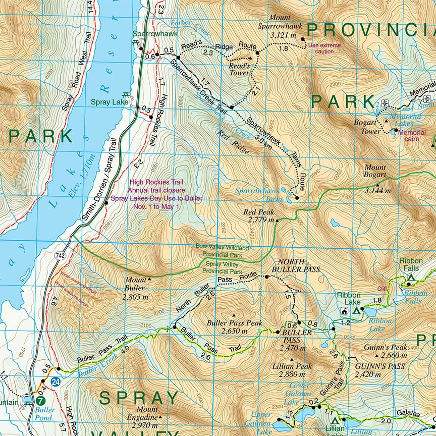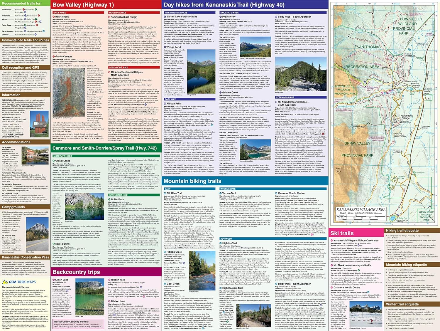 A 1:25,000-scale inset map on the back increases coverage in the vicinity of Kananaskis Village and as far south as Wedge Pond. If you are staying at Kananaskis Village or Mount Kidd RV park, you will find this inset map invaluable.