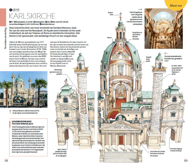 - Opengewerkte illustraties tonen het interieur van must sees, zoals Stephansdom en Karlskirche