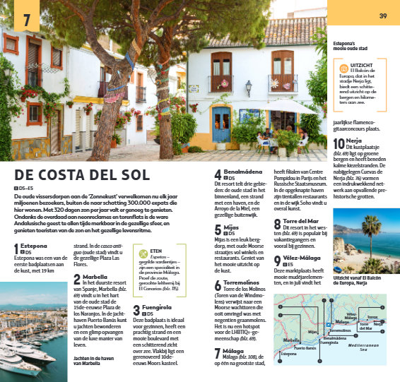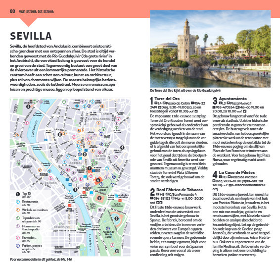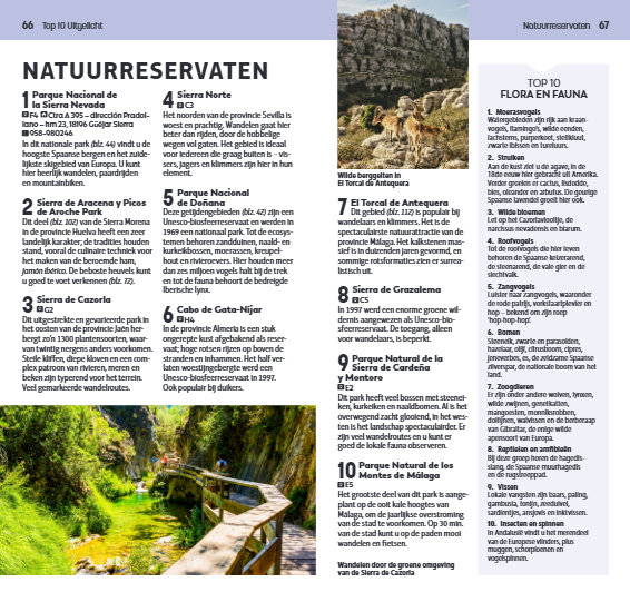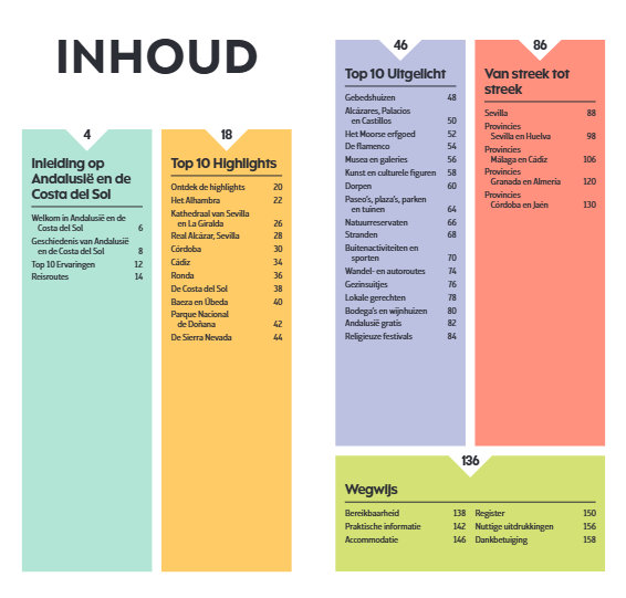 Dankzij de handige top 10-lijstjes heb je een snel overzicht van het beste wat Andalusië te bieden heeft. Of je nu een weekend of een hele week komt, je ziet in een oogopslag welke highlights een bezoek waard zijn, welke dorpen een belevenis zijn, welke musea je absoluut niet moet missen of waar je even kunt ontspannen.