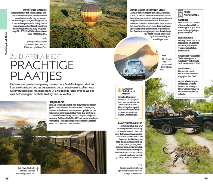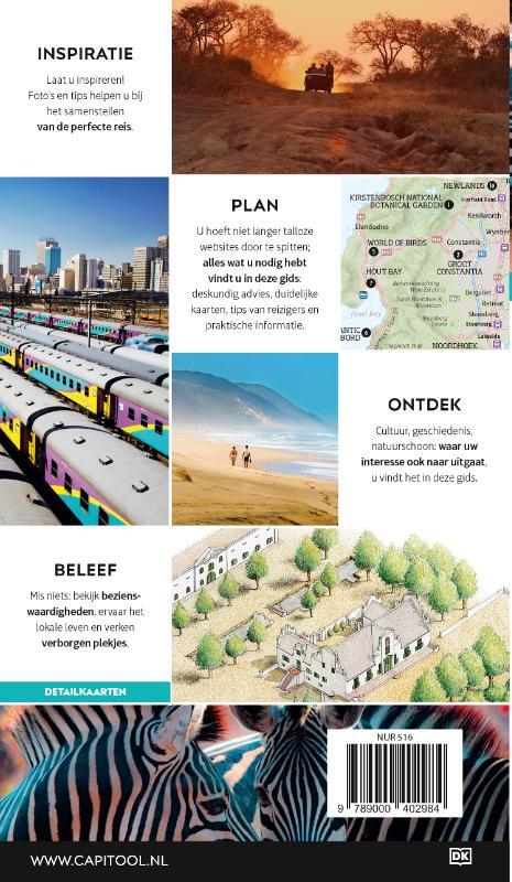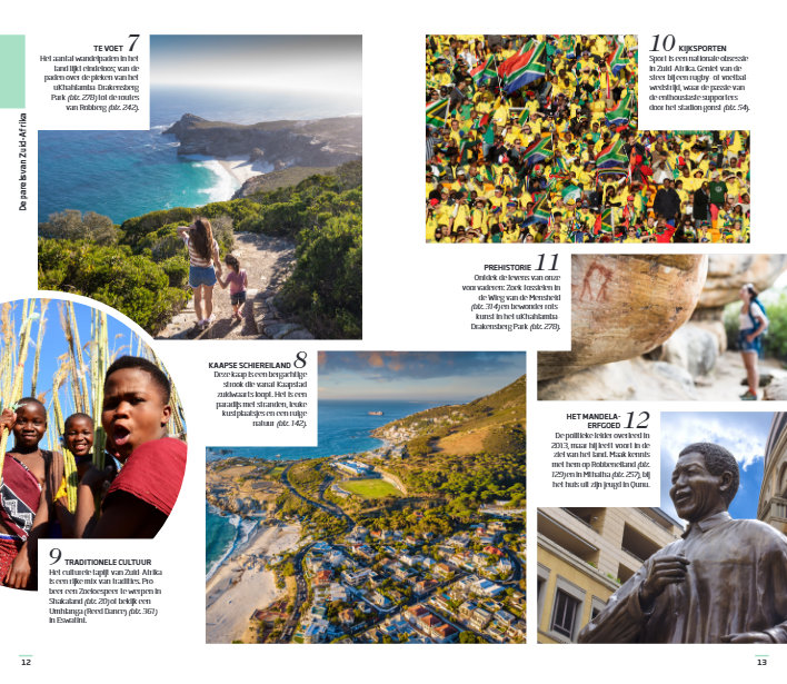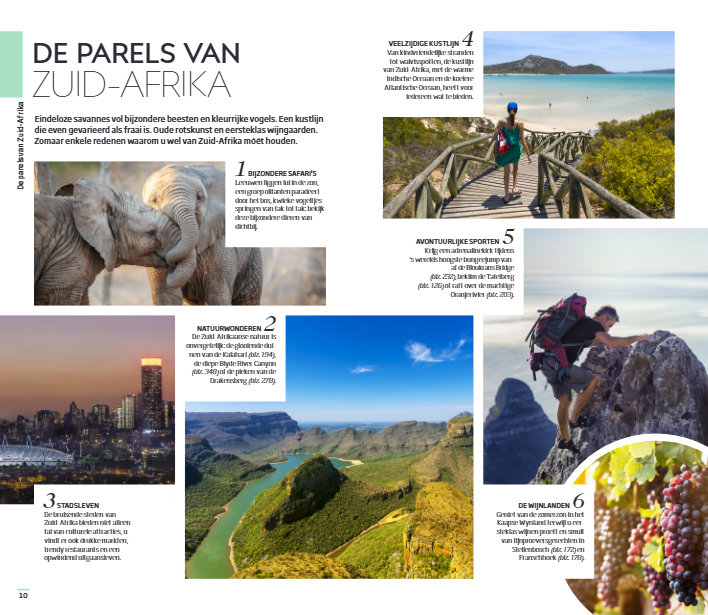 Deze reisgids verdeelt Zuid-Afrika in elf gebieden: Kaapstad, Kaapse Schiereiland, Kaapse Wynland en de westkust, Noordkaap en Vrijstaat, Hermanus en de Overberg, de Tuinroute, Oost-Kaap, KwaZulu-Natal en Lesotho, Johannesburg en omgeving, Limpopo, Mpumalanga en Kruger en Eswatini. Geniet van het levendige Kaapstad en Johannesburg, verdiep je in de tumultueuze geschiedenis in het Apartheid Museum en bewonder het natuurschoon van het Kruger National Park en de Tafelberg; deze reisgids toont je de parels van Zuid-Afrika.